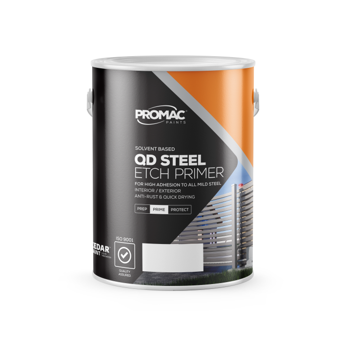 Promac QD Steel Etch Primer is an anti-corrosive primer for mild and galvanised steel which is quick drying and has excellent adhesion. It protects metal and may be overcoated with Promac Quick Drying Gloss Enamel or a range of Promac water and solvent based top coats.